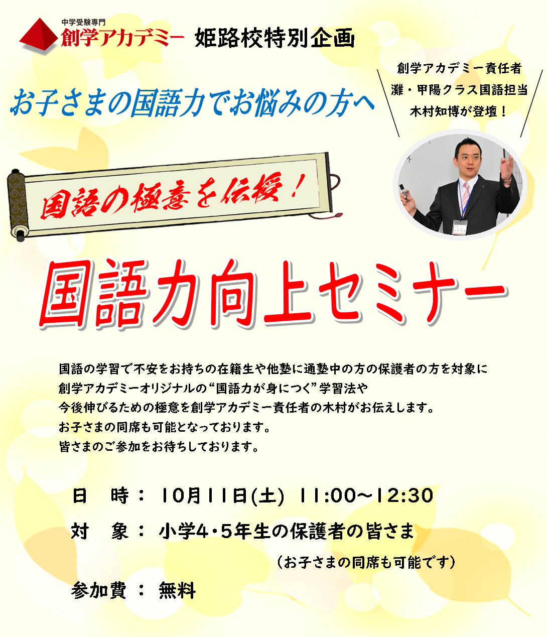 全科目の基礎となる国語の学習法について、10/11(土)に『国語力向上セミナー』を実施します。