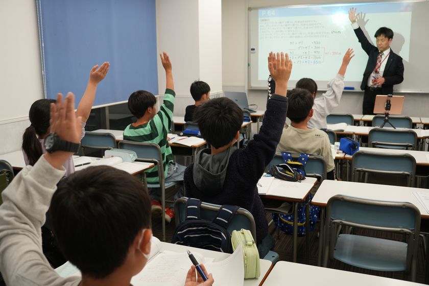 春期講習が終わり、本日から1学期の通常授業が始まりました。春期講習からの新メンバーも加わり、3月以上に活気あふれる授業が各学年で行われています。 5年生の算数では春休みに少し学習した消去算をより深く学習する授業を行いました。「3つのものが出てくる消去算ではどういう風に式を書くんだったかな?」「どの式とどの式を比べればケーキの値段がわかるかな?」と子どもたちに発問を繰り返しながら授業を進めています。