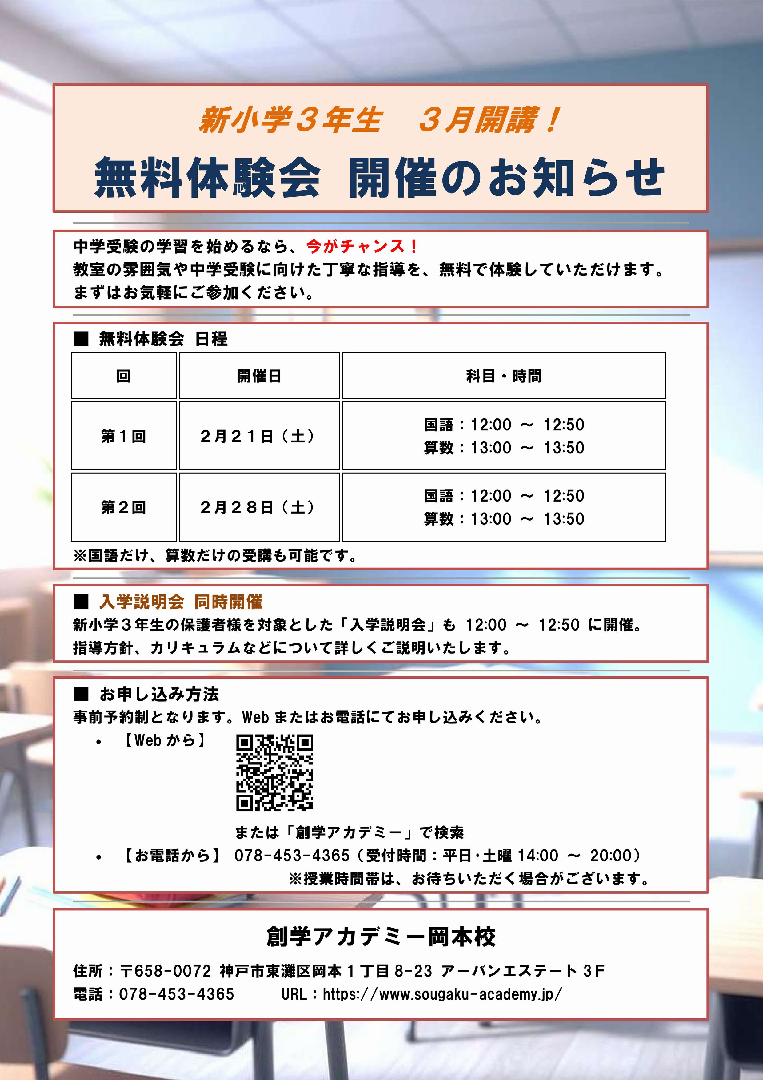創学アカデミーの新小学3年生は3月開講。そこで、開講に先駆けて無料体験会を開催します。 岡本校の新小学3年生は土曜日に開講。週1日の通塾で、無理なく中学受験に向けた学習をはじめることができます。個別に受験相談も承ります。ぜひ一度、無料体験にご参加ください! お申し込みは web または お電話にてお問い合わせください。